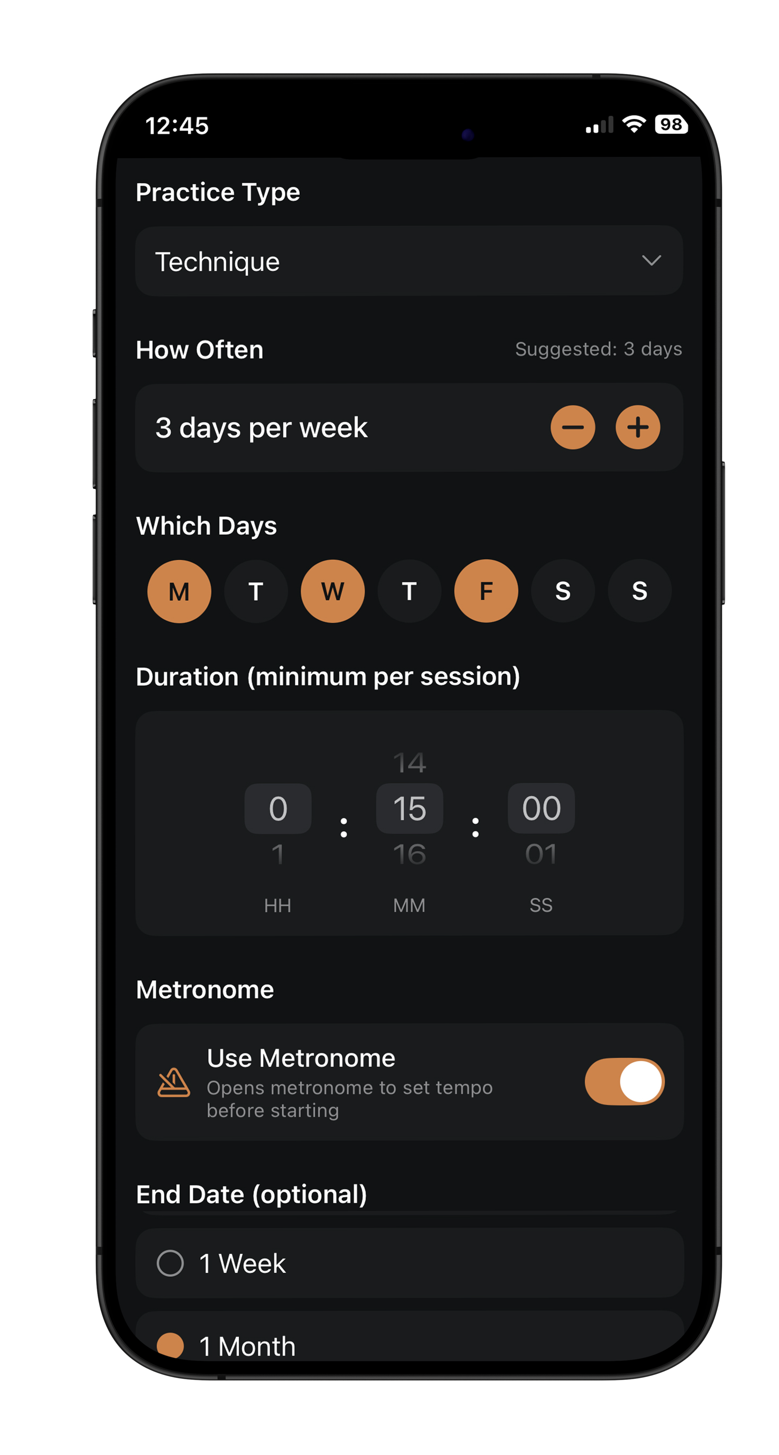 Build consistency with structured practice goals. Set weekly targets like "3 days/week for 4 weeks" or ongoing habits. Track progress in real time with visual indicators that show which goals need attention today. Makeup sessions let you catch missed days without breaking your rhythm.